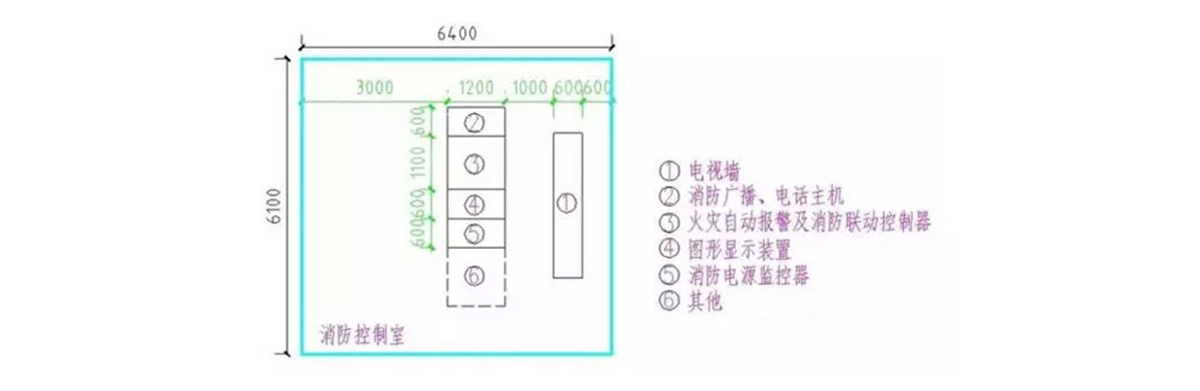 因此,可以总结出:A、对于仅有火灾探测报警无消防联动控制的建筑,只有一台火灾报警控制器,这再简单不过了。B、对于有消防联动控制,但连接探测器回路数相对较少,控制功能较简单的建筑,可选择壁挂式消防控制设备,壁挂设备占用面积比较小,只要保证设备正面操作距离不小于1.2m就可以了,另外值班人员经常工作的一面,设备离墙距离要有3m。C、对于规模较大,报警点数较多,联动控制较复杂的建筑,我们可以选择台式控制器,布置图如下: